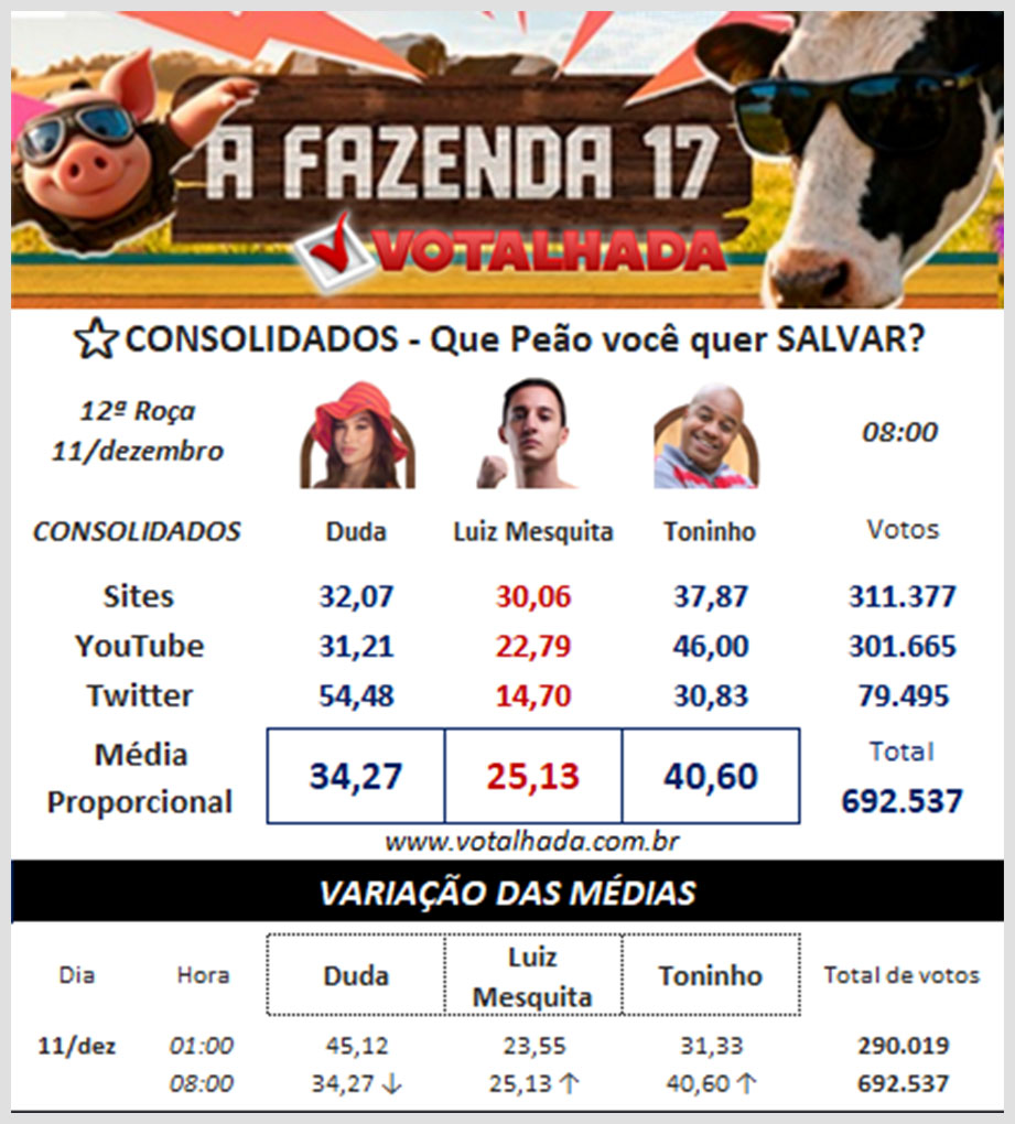 Já no Youtube, o favoritismo é de Toninho. Na plataforma de vídeos, o peão lidera com folga, alcançando 46% dos votos. Duda é a segunda mais votada com 31%, enquanto Mesquita fica na lanterna em mais um cenário, não ultrapassando os 30% dos votos.