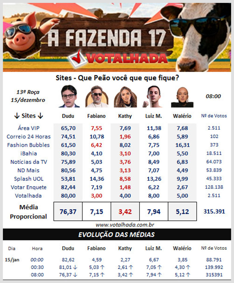 Nas enquetes vinculadas apenas no X, o antigo Twitter, Fabiano também aparece como o próximo eliminado da temporada com apenas 3%. Na rede social, Dudu lidera com 56%, enquanto Mesquita ocupa a vice-liderança com 24%. Kathy/Walério aparecem juntos na enquete — já que o Twitter só permite que quatro opções sejam adicionadas a uma votação — somando 19% dos votos.