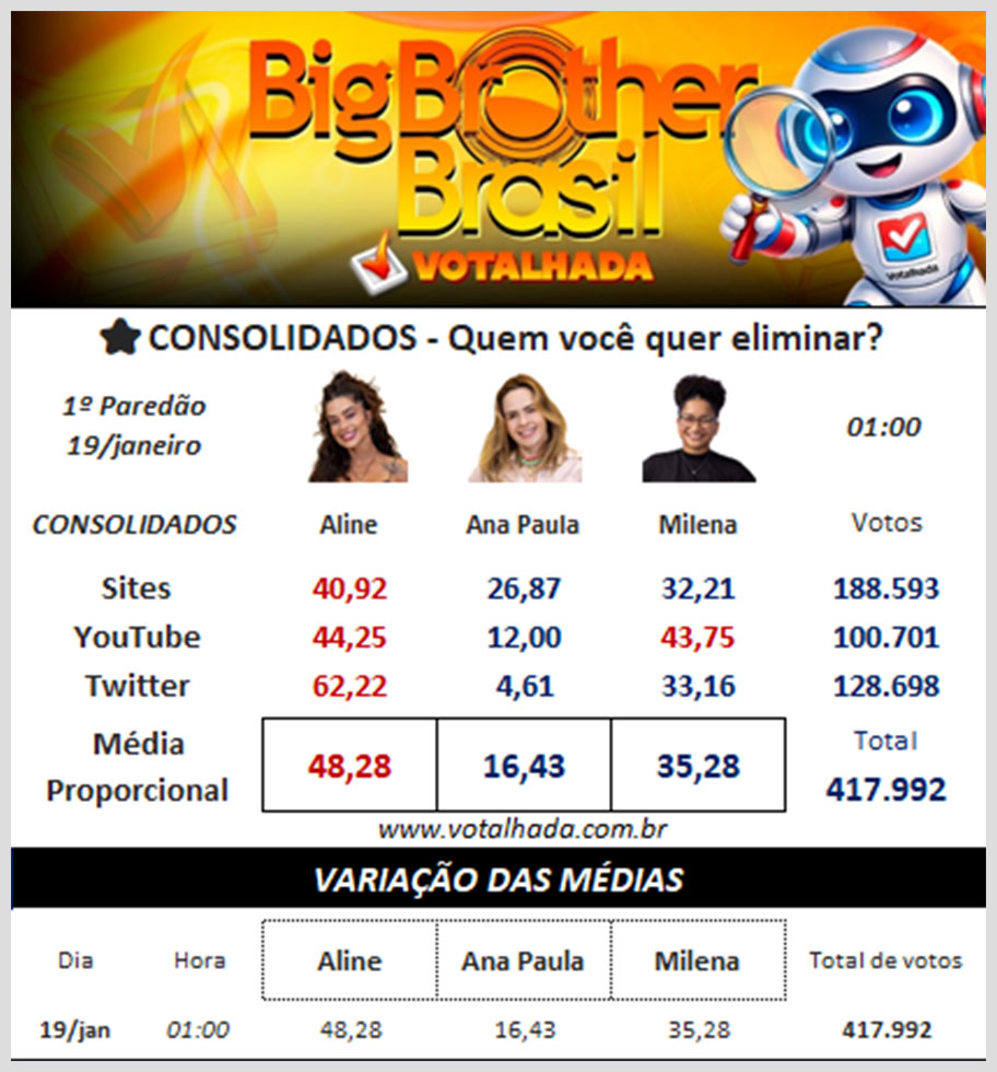Já no Youtube, as parciais apontam empate técnico entre duas participantes: Aline e Milena, que possuem 44% cada na plataforma de vídeos. Ana Paula, por sua vez, aparece em último lugar também neste cenário, com apenas 12% dos votos.