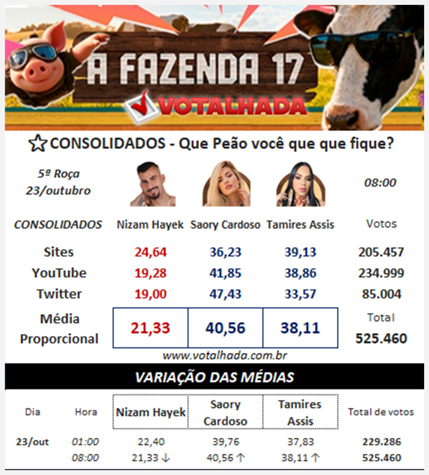 De acordo com dados do Votalhada, que compila os resultados de enquetes vinculadas em sites e redes sociais, Nizam será o quinto eliminado da temporada com 21% dos votos. Saory lidera a média geral com 41%, enquanto Tamires figura na segunda posição com 38%.