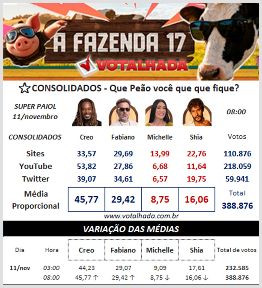 De acordo com dados do Votalhada, que compila os resultados de enquetes vinculadas em sites e redes sociais, Michelle e Shia serão os oitavo e nono eliminados da temporada com 9% e 16% dos votos, respectivamente. Créo lidera a média geral com 46%, enquanto Fabiano aparece em segundo lugar com 29%.