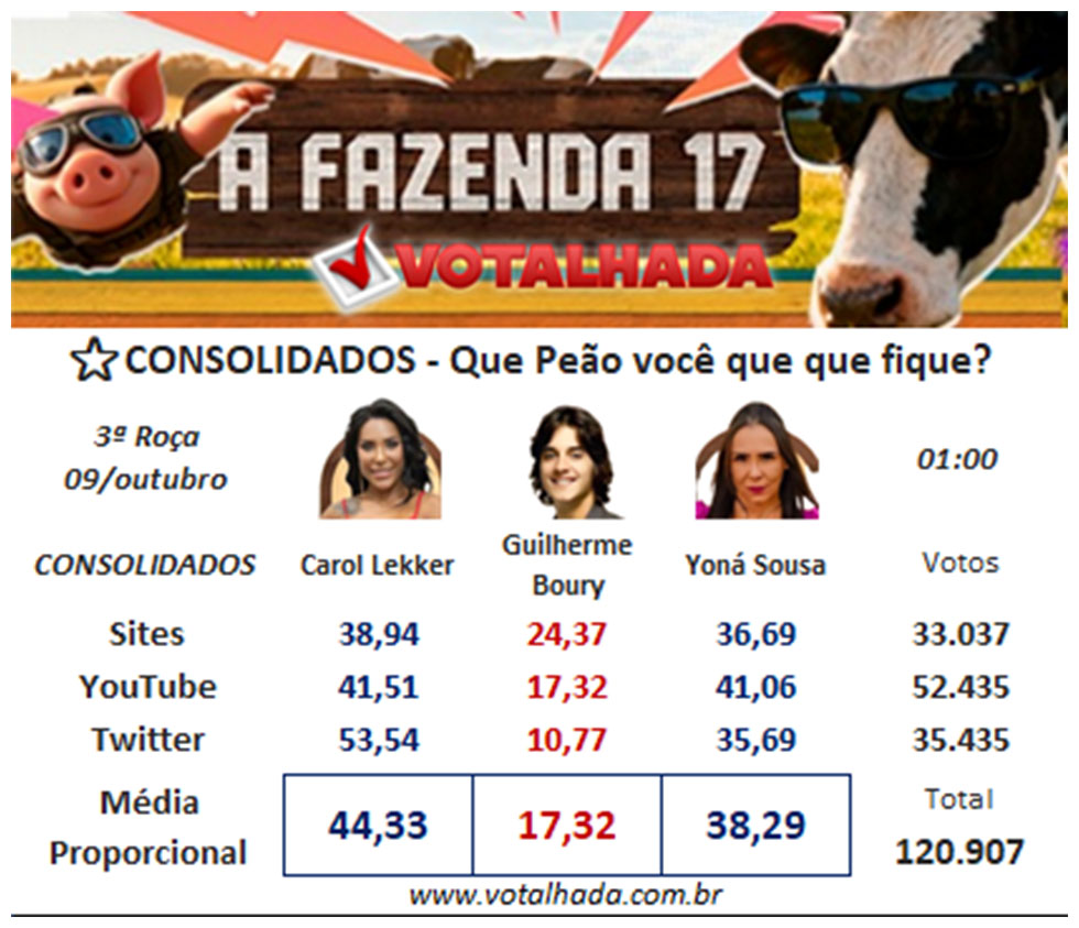 De acordo com dados do Votalhada, que compila os resultados de enquetes vinculadas em sites e redes sociais, Guilherme será o terceiro eliminado da temporada com 17% dos votos. Carol lidera a média geral com 44%, enquanto Yoná aparece na segunda posição com 38%.