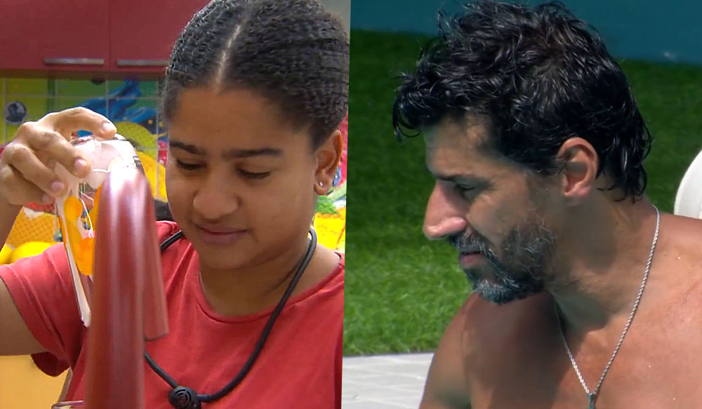 “Ô fiscal de cozinha! Adivinha só quem tá no VIP ainda, querido? Adivinhem, fiscais!”, disparou Milena. “Come tudo, você merece!”, respondeu Jonas, que conversava com Cowboy na piscina.