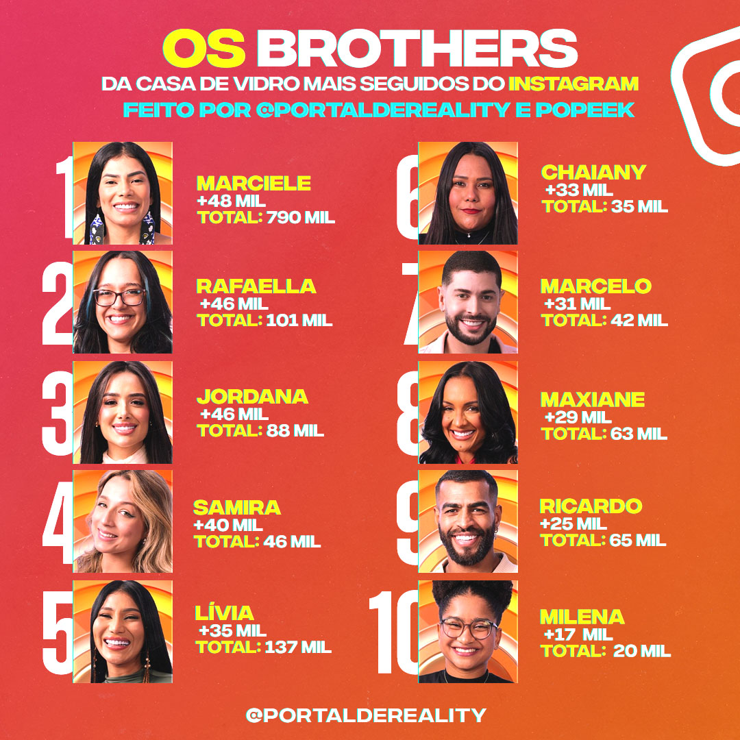 Marciele, representante da região Norte, por exemplo, foi a candidata do BBB 26 que mais ganhou seguidores desde que o elenco foi oficialmente anunciado na sexta-feira (9), com um acréscimo de 48 mil fãs no Instagram. A alagoana Rafaella, da região Nordeste, aparece na segunda posição com um ganho de 46 mil seguidores, seguida por Jordana, do Centro-Oeste, que obteve o mesmo acréscimo.