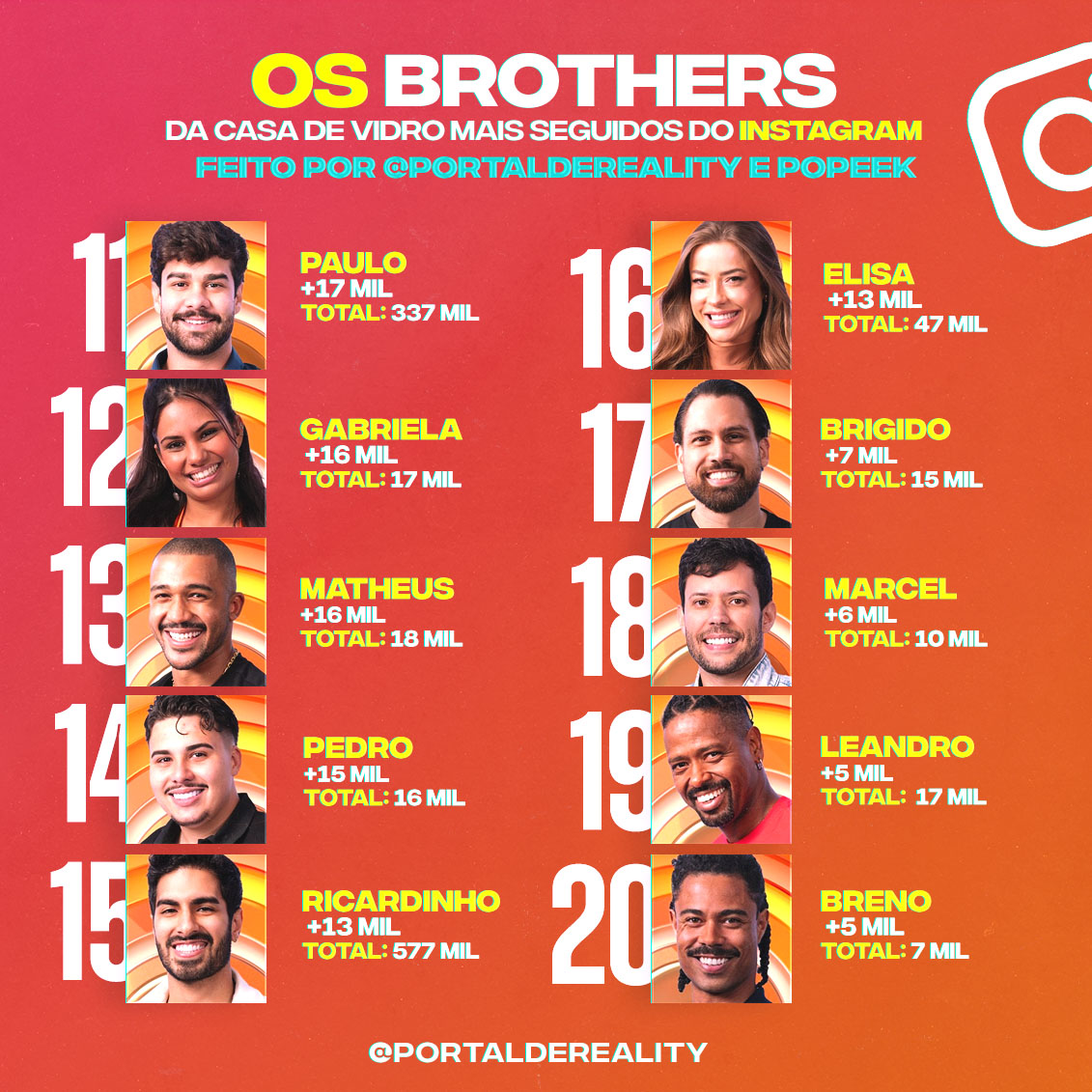 As únicas duas mulheres que ficaram de fora do Top 10 de ganhos foram Gabriela, do Sudeste, e Elisa, do Sul. A pior performance, por sua vez, foi de Breno, também do Sudeste, que ficou na 20ª posição com um acréscimo tímido de apenas 5 mil seguidores.