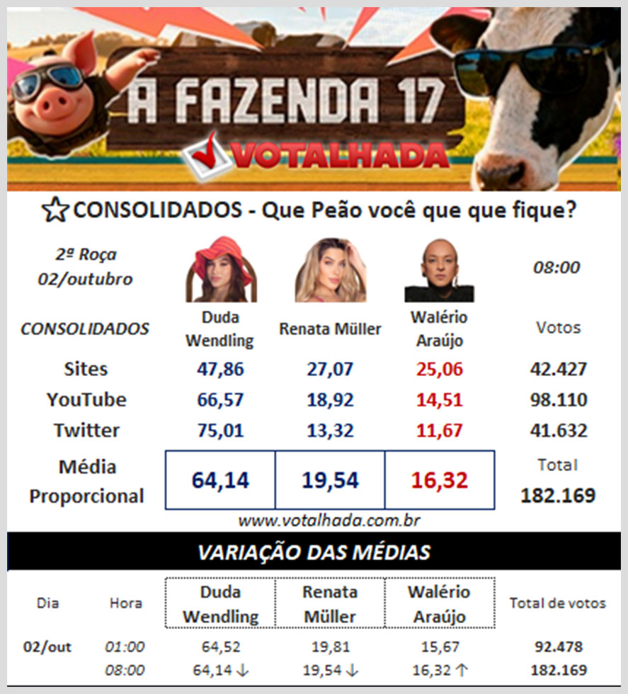 De acordo com dados do Votalhada, que compila os resultados de enquetes vinculadas em sites e redes sociais, Walério será o segundo eliminado da temporada com 16% dos votos. Duda lidera as pesquisas com folga, alcançando 64% na média geral, enquanto Renata aparece na vice-liderança com 20%.