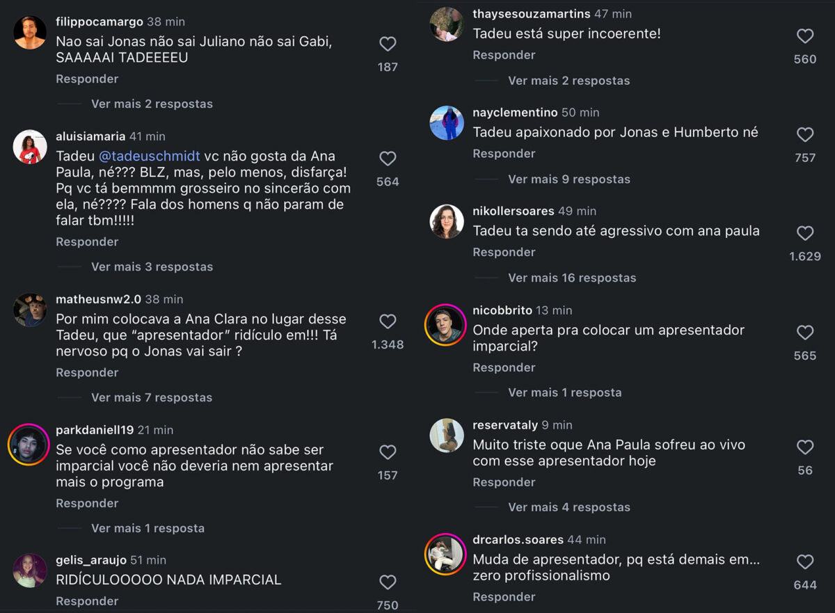 Nas redes sociais, o tratamento de Tadeu com a participante foi alvo de críticas. “Não aguento que o Tadeu nem disfarça que não gosta da Ana Paula”, opinou uma usuária do X, o antigo Twitter. “Acho que o Tadeu atrapalhou demais a performance da Ana Paula hoje. Ele foi tão mal educado com ela, que acabou desestabilizando e travando a participação dela. Postura completamente desigual com os outros participantes”, afirmou uma segunda pessoa.